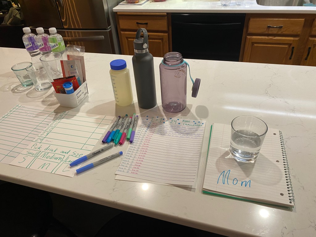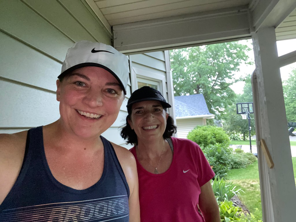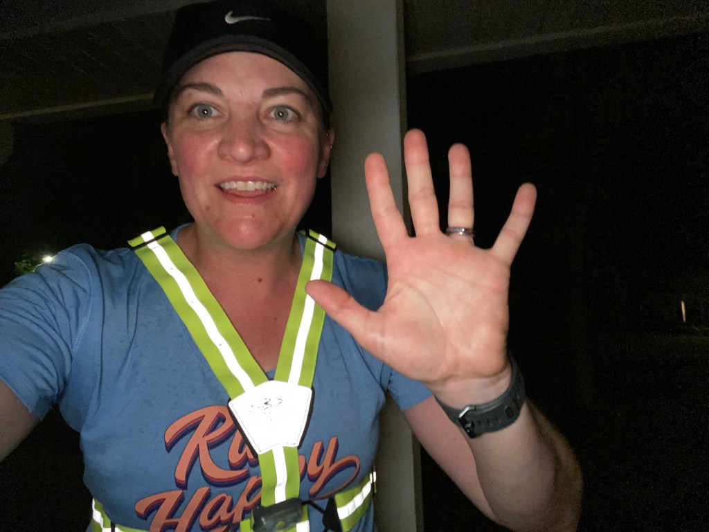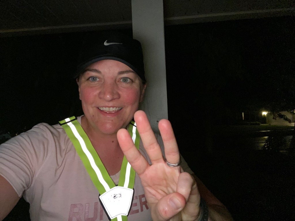 Before I wrap this up, I’ll also just give the top highlight of this little endeavor–hands down the people! I set out to do this on my own, but somehow was fortunate enough to have lots of texted encouragements throughout the whole thing, a couple of running friends joined me for some of the miles, my son (who’s never been a runner) came with me in the dark of night and for the final mile, my daughter took care of all sorts of nourishment and rest needs, my husband ran the start and finish with me, and more great friends created a finish line celebration complete with a finishing tape, medal, decorations, cowbell, cheeseburgers, and beer! Perfect ending to a silly little running goal. Cheers to the next challenges. This one was sure fun!