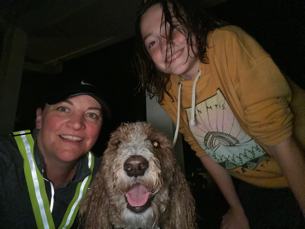 Though the forecast only called for a small chance of rain for a few of my running hours, it actually rained for about half of the time, starting with a steady downpour that began just before the start of Mile 1! I went through a rotation of clothes and shoes, doing laundry as the night went on and the rain kept falling. My hubby ran the bookend miles with me, and to my surprise, my son ran the wee hours–1:00, 2:00, 3:00, and 4:00 a.m. with me. I brought the dog along in the middle of the night, mostly to keep her from getting anxious and waking up the wise family members who were sound asleep. Plus, that added to the fun, since I got to dry her off every mile, too! Wet dog, wet shoes, wet kid, wet everything.